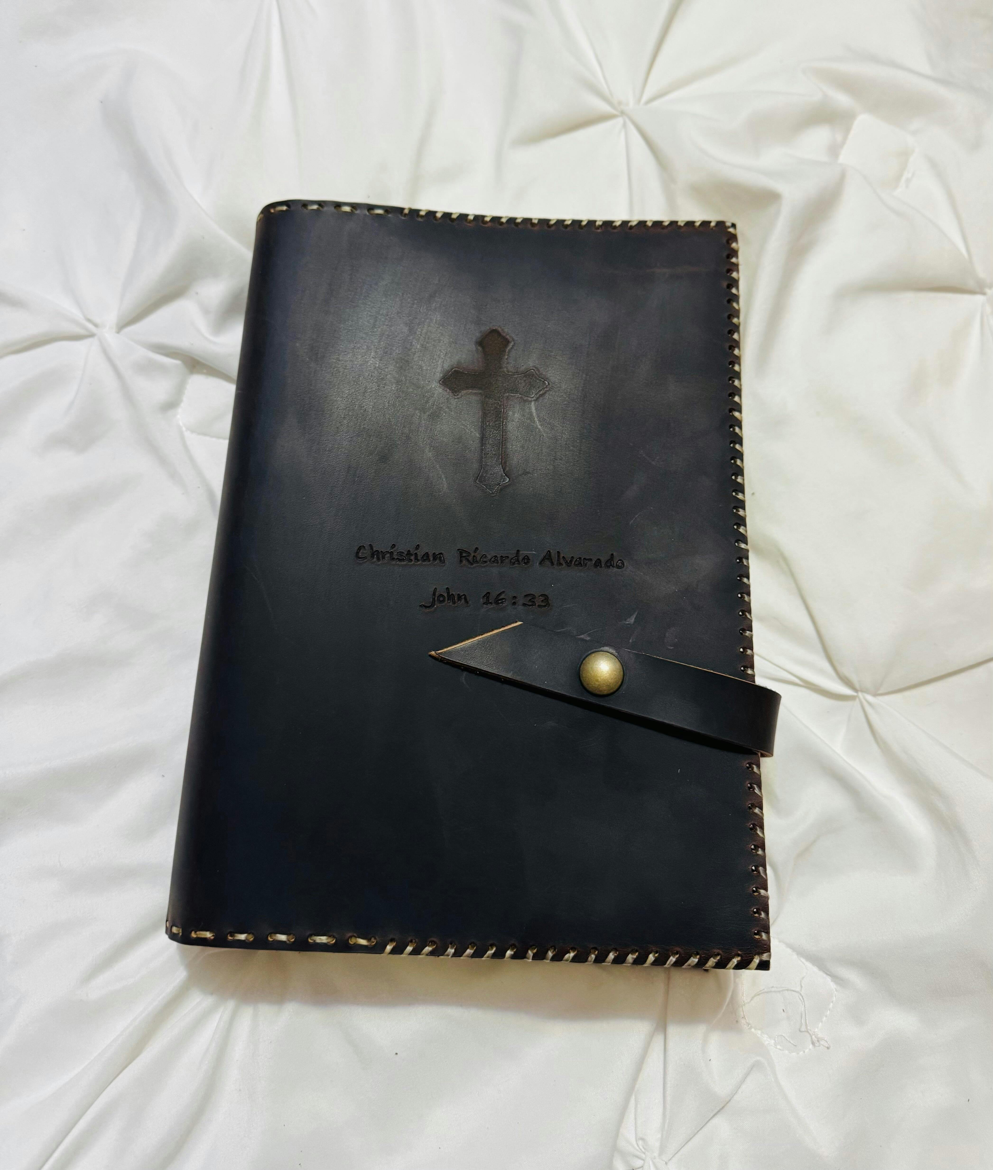 Each themed Bible cover features our oak mesa leather. Stitched with black sinew, the edges and banding give this cover a little more dimension and a classic aesthetic appeal.