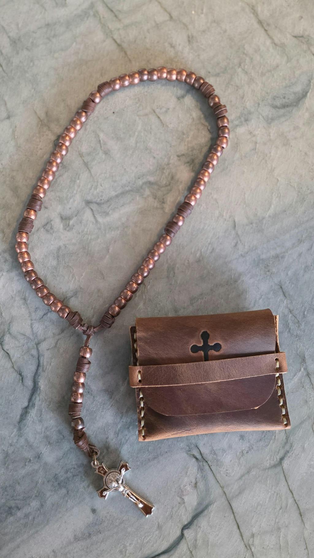 Our handmade rosaries are made with the strongest leather cord available in the USA. This Copperhead Rosary is made with metal beads, and a simple benedictine cross.