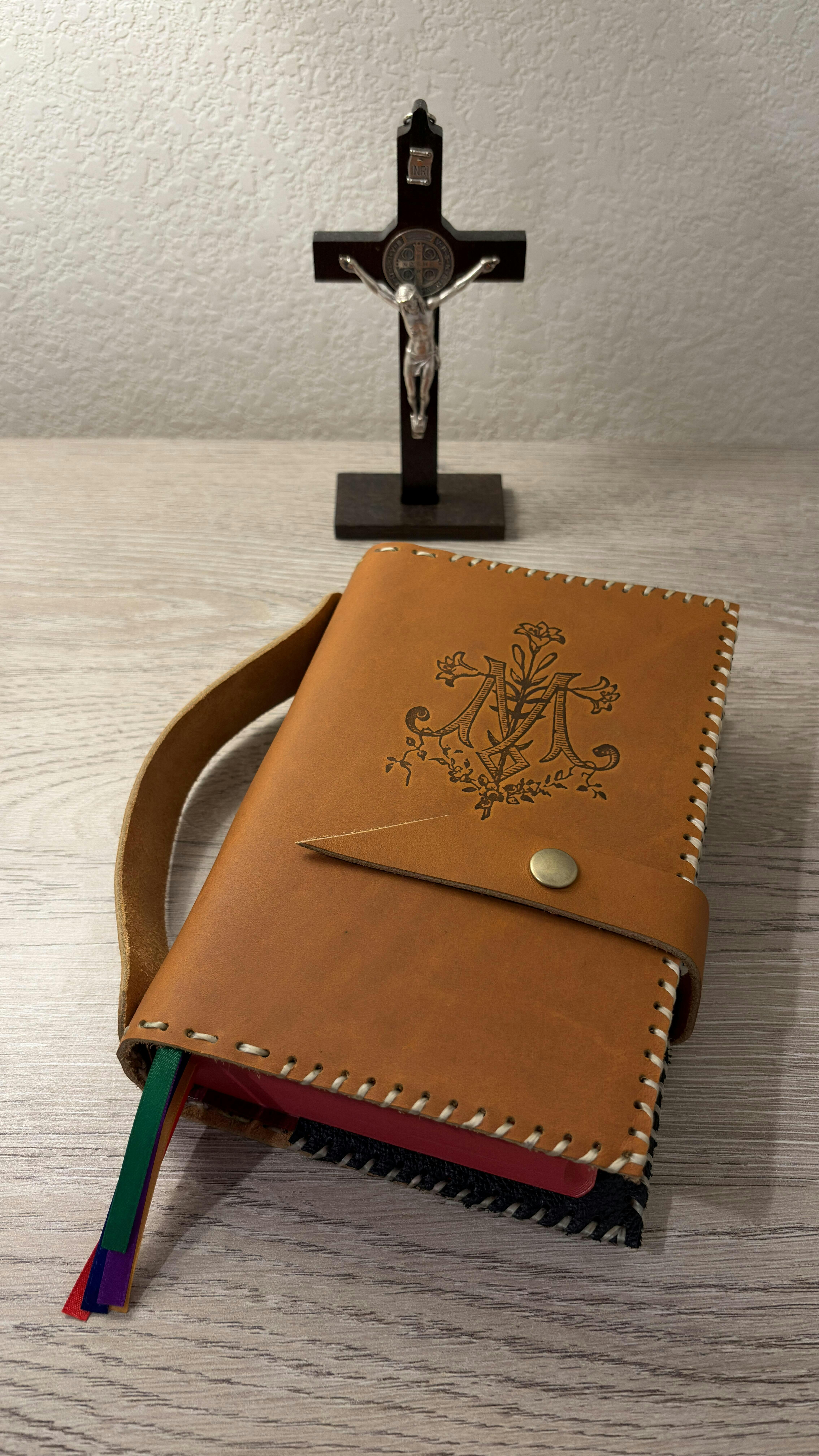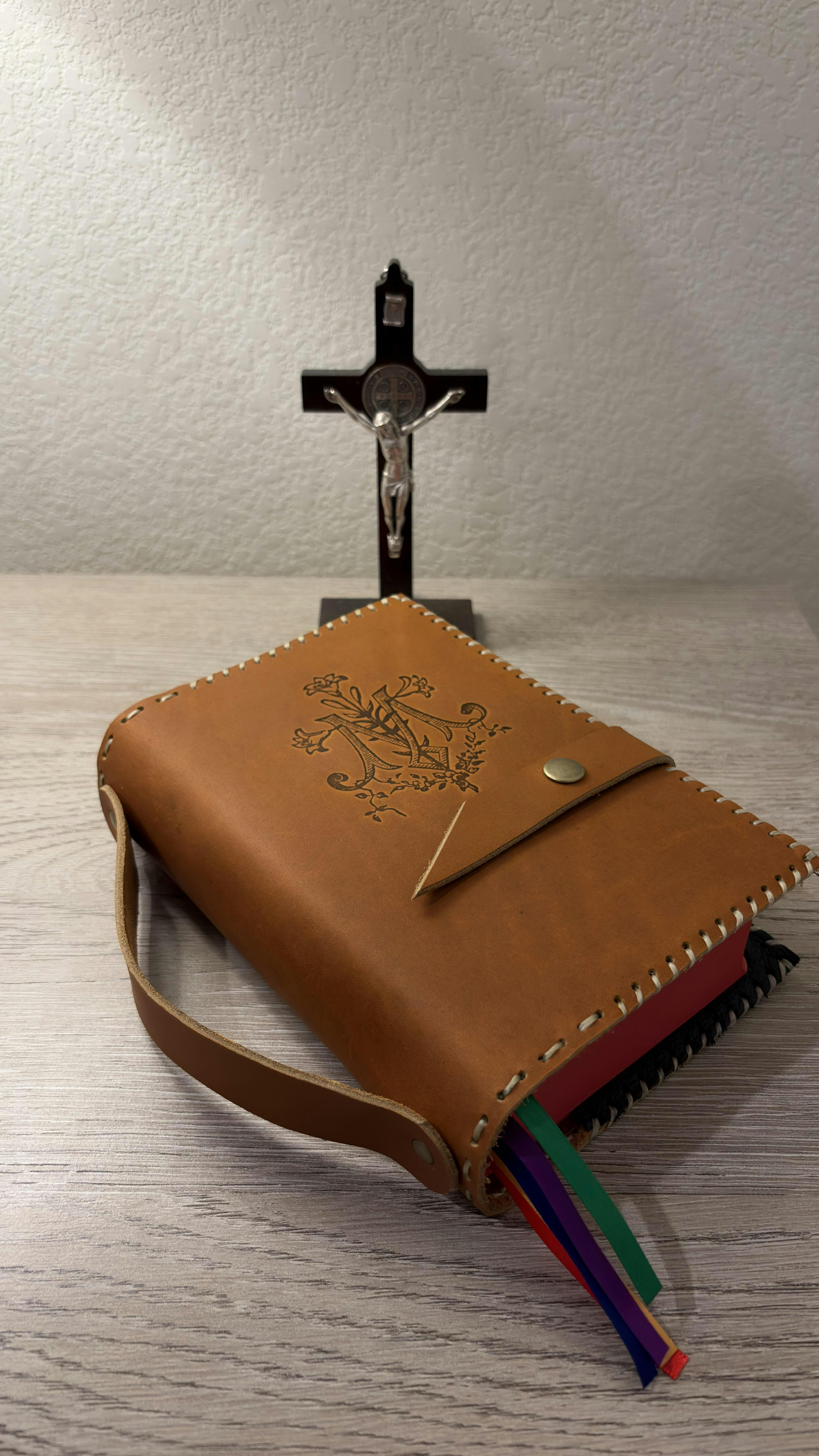 This handcrafted breviary cover features the traditional Auspice Maria symbol—“under the protection of Mary”—formed from the graceful intertwining of the A and M. Interwoven lilies represent St. Joseph, whose quiet strength and faithful guardianship surround the Holy Family and all who pray the Liturgy of the Hours.